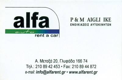 customer tabsΕπικοινωνίαΣτην Alfa auto rent a car έχετε τη δυνατότητα να επιλέξετε οποιοδήποτε όχημαανάλογα με τις ανάγκες σας και σε συνδυασμό με τις προσιτές μας τιμέςμπορείτε να κινηθείτε άνετα και οικονομικά εντός και εκτός Αθηνών.Η εταιρία μας προσφέρει υψηλής ποιότητας υπηρεσίες ενοικίασηςαυτοκινήτων στην Αθήνα και στην υπόλοιπη Ελλάδα από το 1985.Η γρήγορη και φιλική εξυπηρέτηση είναι το κύριο μέλημα μαςκαθώς η ικανοποίηση σας είναι η βασική προτεραιότητα της Alfa auto rent a car.Ο στόλος μας αποτελείται από καινούργια αυτοκίνητα και έχετε τηδυνατότητα να πραγματοποιήσετε από ενοικίαση μικρών αυτοκινήτωνκαι αυτοκινήτων πόλης έως ενοικίαση βαν και πολυτελών αυτοκινήτων στην Αθήνα.Μπορείτε να επιλέξετε το αυτοκίνητο που επιθυμείτε, είτε επισκέπτεστετην Αθήνα για λόγους αναψυχής είτε για επαγγελματικούς λόγουςκαι να κινηθείτε με άνεση, ποιότητα και ασφάλεια.Τα αυτοκίνητα μας ανανεώνονται τακτικά και σε συνδυασμόμε το λεπτομερή έλεγχο και τη συνεχή συντήρηση προσφέρουν αξιοπιστία και σιγουριά.Εάν καταφθάνετε στο Αεροδρόμιο των Αθηνών ή στο λιμάνι του Πειραιά,η Alfa auto rent a car με χαρά μπορεί να σας εξυπηρετήσει άμεσακαι οικονομικά προσφέροντας ειδικές τιμές για κρατήσεις μέσω διαδικτύου.Ενοικιάσεις ΑυτοκινήτωνΤουρισμόςΛεωφόρος Δημάρχου Αγγέλου Μεταξά 20, Γλυφάδα, ΑττικήΓΛΥΦΑΔΑ ΑΤΤΙΚΗΣΑΤΤΙΚΗ 21089424532108944872info@alfarent.grwww.alfarent.gr Το προτείνω (έχει προταθεί 0 φορές) ΦωτογραφίεςFacebook LikeShare on FacebookTweet Widget