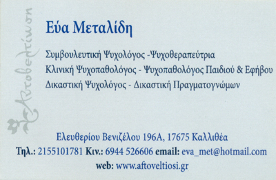 Η Εύα Μεταλλίδη είναι Συμβουλευτική Ψυχολόγος – Ψυχοθεραπεύτρια – Ψυχαναλύτρια, Συνθετικής προσέγγισης, με σπουδές στη Συμβουλευτική Ψυχολογία.
