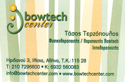 customer tabsΕπικοινωνίαΜε βασικό θεραπευτικό εργαλείο τη Bowtech -την επανάσταση του 21ου αιώνα στον τομέα της υγείας- και πρωτοποριακά διαγνωστικά μέσα, μετατρέψαμε τη θεραπεία σε ένα θεραπευτικό ταξίδι με προορισμό μία καλύτερη ποιότητα ζωής.Στο κέντρο μας ακολουθούμε τις αρχές:Ανθρωποκεντρική ΠροσέγγισηΣεβασμός στη MοναδικότηταΕξατομίκευση του Θεραπευτικού ΠρογράμματοςΟλιστική ΑποκατάστασηΦυσικοθεραπευτέςΕναλλακτικές ΘεραπείεςΥγείαΗριδανού 3, Ιλίσια, ΑθήναΑθανασίου Διάκου 4, ΚηφισιάΑΘΗΝΑ ΑΤΤΙΚΗΣΚΗΦΙΣΙΑ ΑΤΤΙΚΗΣΑΤΤΙΚΗ 2107296600 6932560083bowtechcenter@hotmail.comwww.bowtechcenter.comBowtech Center Το προτείνω (έχει προταθεί 0 φορές) ΦωτογραφίεςFacebook LikeShare on FacebookTweet Widget
