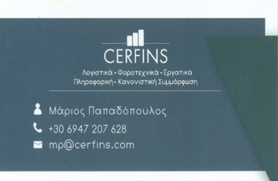 customer tabsΕπικοινωνίαΛογιστικές, Τεχνολογικές & Συμβουλευτικές Υπηρεσίες.Η εταιρεία Cerfins διαθέτει σημαντική εμπειρία στους χώρους των οικονομολογικών υπηρεσιών (λογιστικά, φοροτεχνικά, εργατικά, μισθοδοσία, διαχείριση επενδυτικών προγραμμάτων), ασφαλιστικών υπηρεσιών, καθώς και της μελέτης, εφαρμογής, συντήρησης & πιστοποίησης τεχνικών φακέλων CE και συστημάτων βάσει διεθνών προτύπων ISO στους τομείς διαχείρισης ποιότητας (ISO 9001), ασφάλειας πληροφοριών (ISO 27001), περιβαλλοντικής διαχείρισης (ISO 14000, EMAS), υγιεινής & ασφάλειας εργαζομένων (ISO 18000) και ασφάλειας τροφίμων (αυτοέλεγχος HACCP, ISO 22000).Ο συνδυασμός των συμπληρωματικών αυτών υπηρεσιών στους χώρους των οικονομικών, της πιστοποίησης συστημάτων και των ασφαλιστικών υπηρεσιών, στοχεύει στην ολοκληρωμένη θωράκιση των επιχειρήσεων απέναντι στις προκλήσεις της εγχώριας και διεθνούς αγοράς, καθώς και στην πλήρη κάλυψη των λογιστικών και ασφαλιστικών αναγκών για επαγγελματίες & ιδιώτες.Λογιστικές- Φοροτεχνικές ΥπηρεσίεςΥπηρεσίεςΣουλίου 47, Αγία ΠαρασκευήΦλέμινγκ 1, ΡαφήναΑΓΙΑ ΠΑΡΑΣΚΕΥΗ ΑΤΤΙΚΗΣΡΑΦΗΝΑ ΑΤΤΙΚΗΣΑΤΤΙΚΗ 2111152937 2294024124 6943108147ops@cerfins.comwww.cerfins.comCerfins Το προτείνω (έχει προταθεί 1 φορές) ΦωτογραφίεςFacebook LikeShare on FacebookTweet Widget