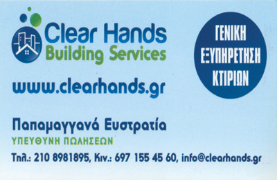 customer tabsΕπικοινωνίαΗ εταιρεία Clear Hands δραστηριοποιείται στην παροχή υπηρεσιώνεξυπηρέτησης πολυκατοικιών από το 1998.Παρέχουμε υπηρεσίες διαχείρισης κτηρίων, καθαρισμούς πολυκατοικιών,έκδοσης κοινοχρήστων και εργασίες συντήρησης όπως:απολυμάνσεις, εγκατάσταση και αναγόμωση πυροσβεστήρων,ετήσια συντήρηση του καυστήρα της πολυκατοικίας σας κλπ.Πλέον δραστηριοποιούμαστε και στον τομέα διαχείρισης ακινήτων,όπως διαμερίσματα προς εκμετάλλευση, κλειστά διαμερίσματα, εξοχικά σπίτια κλπ.Κοινοχρήστων Λογαριασμοί (Διαχείριση Κτιρίων)Συνεργεία ΚαθαρισμούΑπολυμάνσεις - ΑπεντομώσειςΥπηρεσίεςΔόμηση - ΚατοικίαΛεωφόρος Δημάρχου Αγγέλου Μεταξά 34, ΓλυφάδαΓΛΥΦΑΔΑ ΑΤΤΙΚΗΣΑΤΤΙΚΗ 2108981895info@clearhands.grwww.clearhands.grClearhands Το προτείνω (έχει προταθεί 0 φορές) ΦωτογραφίεςFacebook LikeShare on FacebookTweet Widget
