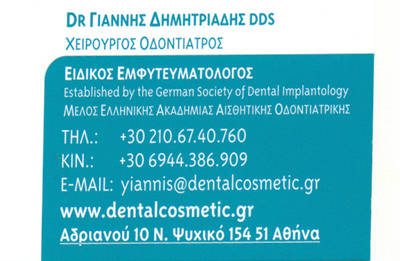 customer tabsΕπικοινωνίαΑισθητική ΟδοντιατρικήΠροσθετική ΟδοντιατρικήΕμφυτεύματαClear AlignerΟζονοθεραπείαΑισθητική ΟδοντιατρικήΥγείαΑνδριανού 10, Νέο ΨυχικόΨΥΧΙΚΟ ΑΤΤΙΚΗΣΑΤΤΙΚΗ 2106740760 6944386909info@dentalcosmetic.grwww.dentalcosmetic.grDental Cosmetic Dr Γιάννης Δημητριάδης Χειρουργός Οδοντίατρος Το προτείνω (έχει προταθεί 0 φορές) ΦωτογραφίεςFacebook LikeShare on FacebookTweet Widget