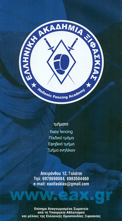customer tabsΕπικοινωνίαΑθλητικά Κέντρα και ΣχολέςΕκπαίδευσηΑπειράνθου 12 & Πλάτωνος, ΓαλάτσιΓΑΛΑΤΣΙ ΑΤΤΙΚΗΣΑΤΤΙΚΗ 6978698084eaxifaskias@gmail.comwww.eax.grΕλληνική Ακαδημία Ξιφασκίας - Γαλάτσι Το προτείνω (έχει προταθεί 1 φορές) ΦωτογραφίεςFacebook LikeShare on FacebookTweet Widget