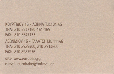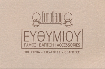 customer tabsΕπικοινωνίαΒιοτεχνία Ειδών Γάμου - Βάπτισης.2η Δ/νση: Κουρτίδου 16, Άνω Πατήσια Γάμου και Βάπτισης ΕίδηΛοιπά Λεωνιδίου 16, ΓαλάτσιΓΑΛΑΤΣΙ ΑΤΤΙΚΗΣΑΤΤΙΚΗ 21029254002102927936info@eurobaby.greurobabe@hotmail.comwww.eurobaby.grEfthimiou Eurobaby Το προτείνω (έχει προταθεί 0 φορές) ΦωτογραφίεςFacebook LikeShare on FacebookTweet Widget