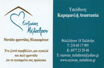 customer tabsΕπικοινωνία 24ωρη ιατρική – Νοσηλευτική φροντίδα Έμπειρο νοσηλευτικό προσωπικό Φυσικοθεραπεία – Εργοθεραπεία σε ειδικά διαμορφωμένο χώρο Ψυχολογική υποστήριξη Επίβλεψη από διαιτολόγο για τις διατροφικές ανάγκες του κάθε ατόμου ξεχωριστάΜονάδες Φροντίδας ΗλικιωμένωνΥπηρεσίεςΦιλελλήνων 18, ΧαλάνδριΧΑΛΑΝΔΡΙ ΑΤΤΙΚΗΣΑΤΤΙΚΗ 2106017995 2106822824 6977232948euzwias_melathron@yahoo.comwww.euzwiasmelathron.gr Το προτείνω (έχει προταθεί 1 φορές) ΦωτογραφίεςFacebook LikeShare on FacebookTweet Widget