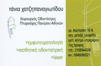 customer tabsΕπικοινωνίαΥπηρεσίες:Αισθητική ΟδοντιατρικήΓενική ΟδοντιατρικήΕμφυτεύματαΘεραπείες LazerΛεύκανση ΔοντιώνΌψεις ΠορσελάνηςΌψεις ΡητίνηςΟυλοπλαστικήBonding-Lifting Δοντιών Αισθητική ΟδοντιατρικήΕμφυτευματολόγοιΥγείαΓρηγορίου Λαμπράκη 16, ΓλυφάδαΓΛΥΦΑΔΑ ΑΤΤΙΚΗΣΑΤΤΙΚΗ 2108944338 6948066521taniachatzi@gmail.comwww.odontiatrosglyfada.grDr Τάνια Χατζηπαναγιωτίδου-Αισθητική Οδοντιατρική-Εμφυτευματολογία Το προτείνω (έχει προταθεί 0 φορές) ΦωτογραφίεςFacebook LikeShare on FacebookTweet Widget