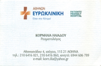 customer tabsΕπικοινωνίαΩράριο ιατρείου:Τρίτη 09:30 - 13:30 & 18:30 - 21:00Ωράριο Ευρωκλινικής:Κάθε Τετάρτη κατόπιν ραντεβούΡευματολόγοιΥγεία2ας Μαϊου 4, Νέα ΣμύρνηΝΕΑ ΣΜΥΡΝΗ ΑΤΤΙΚΗΣΑΤΤΙΚΗ 2109319840 2106416860 - Κλινική 6944606789korni.ilia@yahoo.gr Το προτείνω (έχει προταθεί 0 φορές) ΦωτογραφίεςFacebook LikeShare on FacebookTweet Widget