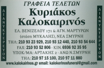 customer tabsΕπικοινωνίαΜνημόσυνα - Στολισμοί - Αποτεφρώσεις - Μεταφορά σωρών.Γραφεία ΤελετώνΥπηρεσίεςΕλ. Βενιζέλου 171 & Αγνώστων Μαρτύεων(στάση Μυκάλης), Νέα ΣμύρνηΝΕΑ ΣΜΥΡΝΗ ΑΤΤΙΚΗΣΑΤΤΙΚΗ 2109323929 2109337918ermionichalkidou@yahoo.comwww.kalokairinos.gr Το προτείνω (έχει προταθεί 0 φορές) ΦωτογραφίεςFacebook LikeShare on FacebookTweet Widget