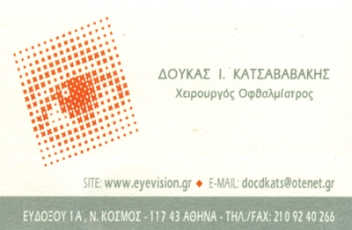 customer tabsΕπικοινωνίαΟ Κ. Κατσαβαβάκης γεννήθηκε το 1957 στην Αλεξανδρούπολη. Αποφοίτησε το 1982 από την ιατρική σχολή παν. Αθηνών. Εκπαιδεύτηκε στο Οφθαλμιατρείο Αθηνών και έλαβε τον τίτλο ειδικότητας της Οφθαλμολογίας τον Σεπτέμβριο (1991). Διετέλεσε επί τριετία επιστημονικός συνεργάτης της Παν/κής Οφθαλ/κής Κλινικής στο τμήμα Αμφιβληστροειδούς-LASER όπου εξειδικεύτηκε στην ψηφιακή Φλουοραγγειογραφία, Ινδοκυανίνη και στην εφαρμογή των LASER στον οφθαλμό. Από το 2002 είναι επιστημονικός συνεργάτης, υπεύθυνος τμήματος ψηφιακής Φλουοραγγειογραφίας στο Νοσ. Metropolitan. Είναι εξειδικευμένος στην επέμβαση Καταρράκτη μικρής τομής με φακοθρυψία και στη Διαθλαστική Χειρουργική με Excimer Laser για τη διόρθωση των διαθλαστικών ανωμαλιών.Είναι μέλος της:Ελληνικής Οφθαλμολογικής εταιρείαςΕλληνικής Εταιρείας Ενδοφακών και Διαθλαστικής Χειρουργικής.Ευρωπαϊκής Εταιρείας Χειρουργών Καταρράκτη και Διαθλαστικής χειρουργικής.Έχει πλούσιο συγγραφικό έργο με πολλές ανακοινώσεις σε Οφθαλ/κά περιοδικά, σε ελληνικά, διεθνή Οφθαλ/κά Συνέδρια και μετάφραση της Επίτομης Οφθαλμολογίας του Kanski.Συνεργάζεται με το Νοσοκομείο Metropolitan, την Κεντρική Κλινική Αθηνών και το Αθηναϊκό Διαθλαστικό κέντρο.Πιστοποιημένος ΕΟΠΥΥΔιαγνωστικές εξετάσειςΠλήρες οφθαλμολογικό check upΑ-Β υπερηχογραφίαΥπερηχητική βιομετρίαΒυθοσκόπηση και ψηφιακή φωτογράφιση βυθού χωρίς μυδρίασηΠαχυμετρία κερατοειδούςΤοπογραφίαΟπτική τομογραφία συνοχής (OCT)Οπτικά πεδίαΦλουοροαγγειογραφία - ICG στο Νοσοκομείο MetropolitanΕφαρμογές LaserΔιόρθωση Μυωπίας, Υπερμετρωπίας, Αστιγματισμού με ExcimerLaser (Αθηναϊκό Διαθλαστικό Κέντρο)Φωτοπηξία Green Laser παθήσεων ΑμφιβληστροειδούςYAG laser για τη θόλωση του οπισθίου περιφακίουΧειρουργικές επεμβάσειςΕγχείρηση καταρράκτη με υπερήχουςΕγχείρηση ΓλαυκώματοςΕγχείρηση Πτερυγίου, Χαλαζίου, Ογκιδίων βλεφάρου, ΞανθελασμάτωνΕνδοβολβικές ενέσεις αντί - Vegf παραγόντων.Δέχεται καθημερινά απόγευμα 17:30 -21:00Εκτός Παρασκευής με ραντεβού ΟφθαλμίατροιΥγείαΕυδόξου 1α, Νέος Κόσμος, ΑττικήΝΕΟΣ ΚΟΣΜΟΣ ΑΘΗΝΩΝΑΤΤΙΚΗ 2109240266 6932710495info@eyevision.grwww.eyevision.gr Το προτείνω (έχει προταθεί 0 φορές) ΦωτογραφίεςFacebook LikeShare on FacebookTweet Widget