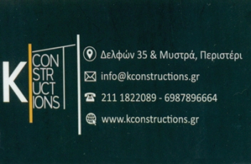 customer tabsΕπικοινωνίαΚατασκευές - Ανακαινίσεις - Επισκευές - Προσθήκες.Κατασκευαστικές ΕταιρείεςΤεχνικά Γραφεία και ΕταιρείεςΟικοδομικές Επιχειρήσεις και ΕργασίεςΔόμηση - ΚατοικίαΔελφων 35, ΠεριστέριΠΕΡΙΣΤΕΡΙ ΑΤΤΙΚΗΣΑΤΤΙΚΗ 2111822089 6987896664info@kconstructions.grwww.kconstructions.grKConstructions Το προτείνω (έχει προταθεί 1 φορές) ΦωτογραφίεςFacebook LikeShare on FacebookTweet Widget