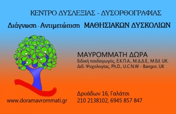 customer tabsΕπικοινωνίαΔΡ.ΨΥΧΟΛΟΓΙΑΣ , ΕΚΠΑΙΔΕΥΤΙΚΟΣ ΕΙΔΙΚΗΣ ΑΓΩΓΗΣ , M.E.D.PH.D. , ΕΔΕΙΔΙΚΕΥΣΗ ΣΤΗΝ ΔΥΣΛΕΞΙΑ ,ΣΥΜΒΟΥΛΕΥΤΙΚΗ , ΑΠΟΚΑΤΑΣΤΑΣΗ ΔΥΣΛΕΞΙΑΣ , ΔΕΧΕΤΑΙ ΜΕ ΡΑΝΤΕΒΟΥΛογοπεδικοί - ΛογοθεραπευτέςΥγείαΔρυάδων 16, Γαλάτσι 111 46ΓΑΛΑΤΣΙ ΑΤΤΙΚΗΣΑΤΤΙΚΗ 2102138102 6945857847doram@otenet.gr Το προτείνω (έχει προταθεί 0 φορές) ΦωτογραφίεςFacebook LikeShare on FacebookTweet Widget