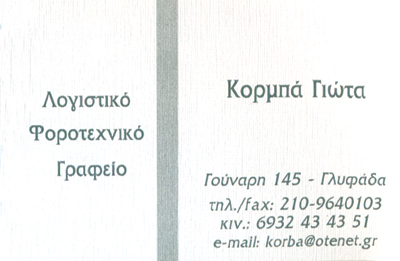customer tabsΕπικοινωνίαΛογιστικές- Φοροτεχνικές ΥπηρεσίεςΥπηρεσίεςΔημ. Γούναρη 145, ΓλυφάδαΓΛΥΦΑΔΑ ΑΤΤΙΚΗΣΑΤΤΙΚΗ 2109640130 6932434351korba@otenet.grΛογιστικό Γραφείο Κορμπά Γιώτα & Συνεργάτες Το προτείνω (έχει προταθεί 4 φορές) ΦωτογραφίεςFacebook LikeShare on FacebookTweet Widget