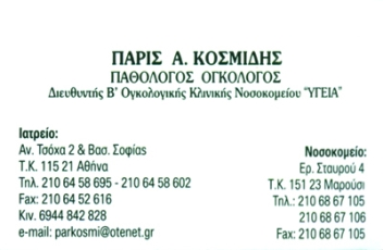 customer tabsΕπικοινωνίαΠαθολόγος - ΟγκολόγοςΔιευθυντής Β' Ογκολογικής Κλινικής Νοσοκομείου "ΥΓΕΙΑ"Νοσοκομείο: Ερ. Σταυρού 4, ΜαρούσιΤηλ.: 2106867105, 2106867106, Φάξ: 2106867105ΟγκολόγοιΥγείαΠαθολόγοιΤσόχα Αναστασίου 2 & Βασιλίσσης Σοφίας, ΑθήναΑΘΗΝΑ ΑΤΤΙΚΗΣΜΑΡΟΥΣΙ ΑΤΤΙΚΗΣΑΤΤΙΚΗ 2106458602 2106458695 69448428282106452616parkosmi@otenet.gr Το προτείνω (έχει προταθεί 0 φορές) ΦωτογραφίεςFacebook LikeShare on FacebookTweet Widget