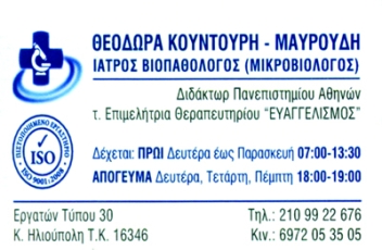 customer tabsΕπικοινωνίαΩράριο: Δευτέρα - Τρίτη - Πέμπτη07:30 -13:30 & 18:00 -19:00ΜικροβιολόγοιΥγείαΕργατών Τύπου 30, Ηλιούπολη, ΑττικήΗΛΙΟΥΠΟΛΗ ΑΤΤΙΚΗΣΑΤΤΙΚΗ 2109922676 6972053505 Το προτείνω (έχει προταθεί 0 φορές) ΦωτογραφίεςFacebook LikeShare on FacebookTweet Widget