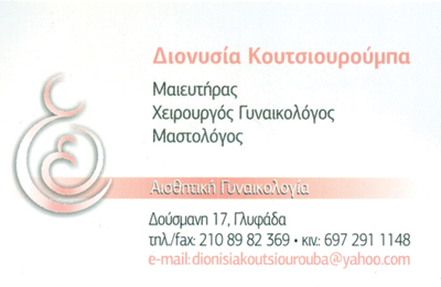 customer tabsΕπικοινωνίαΣυνεργάζεται με γυναικολογικές κλινικές: ΡΕΑ & ΙΑΣΩΜαιευτήρες - ΓυναικολόγοιΥγείαΔούσμανη 17ΓΛΥΦΑΔΑ ΑΤΤΙΚΗΣΑΤΤΙΚΗ 2108982369 6972911148dionisiatsiourouba@yahoo.com Το προτείνω (έχει προταθεί 1 φορές) ΦωτογραφίεςFacebook LikeShare on FacebookTweet Widget
