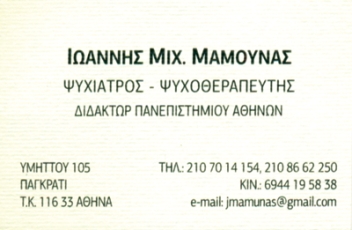 customer tabsΕπικοινωνία2η διεύθυνση: Οιδίποδος 41, Θήβα.Δέχεται καθημερινά, κατόπιν ραντεβού.ΨυχίατροιΨυχοθεραπευτέςΥγείαΥμηττού 105, Παγκράτι, ΑττικήΠΑΓΚΡΑΤΙ ΑΤΤΙΚΗΣΑΤΤΙΚΗ 2107014154 6944195838gmamunas@gmail.com Το προτείνω (έχει προταθεί 0 φορές) ΦωτογραφίεςFacebook LikeShare on FacebookTweet Widget