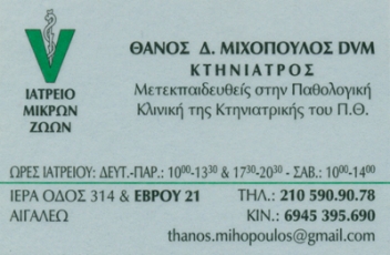 customer tabsΕπικοινωνίαΤο κτηνιατρείο μας είναι πλήρως εξοπλισμένο και παρέχουμεολοκληρωμένη φροντίδα για την καλύτερη αντιμετώπισηπαθολογικών περισταστικών που παρουσιάζονται στους μικρούς μας φίλους.Υπηρεσίες κτηνιατρείου:Επείγοντα περιστατικάΧειρουργικόΑκτινολογικόΑιματολογικόΕξέτασηΜικροβιολογικές εξετάσειςΩράριο:Δευτέρα - Παρασκευή: 10:00 - 13:30 & 17:30 - 20:30Σάββατο 10:00 - 14:00Κτηνιατρεία και Κτηνιατρικές ΚλινικέςΥγείαΙεράς Οδού 314 & Έβρου 21, Αιγάλεω, ΑττικήΑΙΓΑΛΕΩ ΑΤΤΙΚΗΣΑΤΤΙΚΗ 2105909078 6945395690thanos.mihopoulos@gmail.com Το προτείνω (έχει προταθεί 0 φορές) ΦωτογραφίεςFacebook LikeShare on FacebookTweet Widget