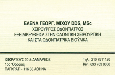 customer tabsΕπικοινωνίαΩράριο:Δευτέρα & Τετάρτη 17:00 - 20:00Τρίτη - Παρασκευή 09:00 - 13:00κατόπιν ραντεβούΧειρουργοί ΟδοντίατροιΟδοντίατροιΥγείαΙφικράτους 20 & Δάρεως, ΠαγκράτιΠΑΓΚΡΑΤΙ ΑΤΤΙΚΗΣΑΤΤΙΚΗ 2107511120 6937638008helenamichou@outlook.com Το προτείνω (έχει προταθεί 0 φορές) ΦωτογραφίεςFacebook LikeShare on FacebookTweet Widget