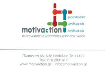 customer tabsΕπικοινωνίαΤο Κέντρο Ανάπτυξης Λειτουργικών Δεξιοτήτων Παιδιού “Motivaction”,είναι ένα σύγχρονο θεραπευτικό κέντρο για παιδιά με διαφόρωνειδών κινητικές και αναπτυξιακές δυσκολίες.Δημιουργήθηκε το 2014 από μια διεπιστημονική ομάδα θεραπευτών - φυσικοθεραπεία,εργοθεραπεία, λογοθεραπεία - με στόχο την ολοκληρωμένη θεραπευτικήπροσέγγιση του κάθε παιδιού ξεχωριστά καθώς και τη βελτίωσητων καθημερινών αναγκών των παιδιών και των οικογενειών τους.Το κέντρο μας είναι ένα άρτια εξοπλισμένο και φιλικό προς το παιδί χώρο,κατάλληλο για βρέφη και παιδιά όλων των ηλικιών.Υπηρεσίες:ΕργοθεραπείαΦυσικοθεραπείαΛογοθεραπείαΕιδική διαπαιδαγώγησηΠρώιμη ΠαρέμβασηΣυμβουλευτική Γονέων Λογοπεδικοί - ΛογοθεραπευτέςΦυσικοθεραπευτέςΕργοθεραπείαΥγείαΠλαπούτα 66, Νέο ΗράκλειοΗΡΑΚΛΕΙΟ ΑΤΤΙΚΗΣΑΤΤΙΚΗ 2102831617info@motivaction.grwww.motivaction.grMotivaction Το προτείνω (έχει προταθεί 0 φορές) ΦωτογραφίεςFacebook LikeShare on FacebookTweet Widget