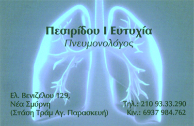 customer tabsΕπικοινωνίαΩράριο: Πρωί και ΑπόγευμαΠνευμονολόγοι - ΦυματιολόγοιΥγείαΕλ. Βενιζέλου 129, Νέα Σμύρνη, ΑττικήΝΕΑ ΣΜΥΡΝΗ ΑΤΤΙΚΗΣΑΤΤΙΚΗ 2109333290 6937984762epesiridou@gmail.com Το προτείνω (έχει προταθεί 0 φορές) ΦωτογραφίεςFacebook LikeShare on FacebookTweet Widget