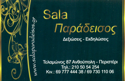 customer tabsΕπικοινωνίαΑίθουσες Κοινωνικών ΕκδηλώσεωνΔιασκέδαση - ΕστίασηΤελαμώνος 87, ΠεριστέριΠΕΡΙΣΤΕΡΙ ΑΤΤΙΚΗΣΑΤΤΙΚΗ 2105054254 2105621731 6973011006smpotsaris@gmail.grwww.salaparadeisos.gr Το προτείνω (έχει προταθεί 0 φορές) ΦωτογραφίεςFacebook LikeShare on FacebookTweet Widget