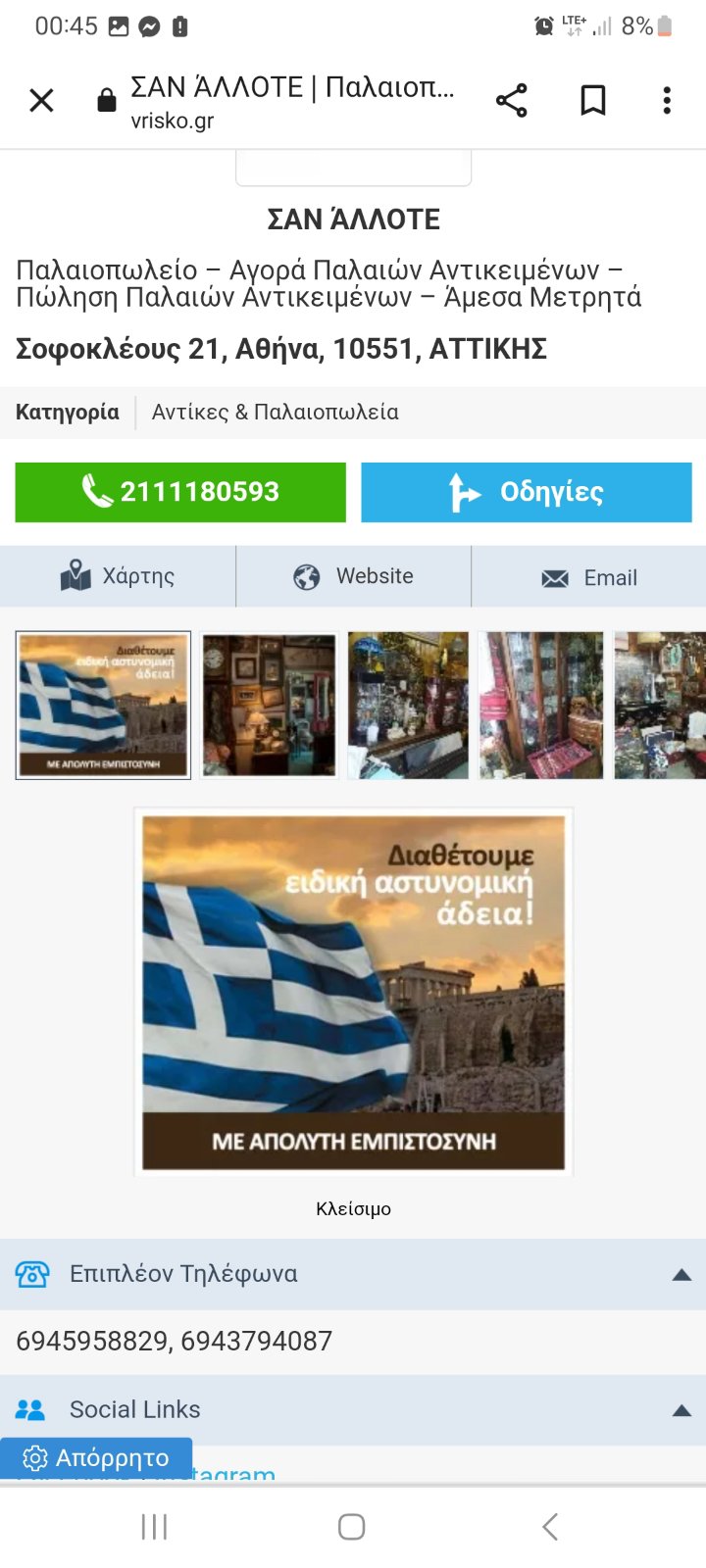 customer tabsΕπικοινωνίαΠαλαιοπωλείο, αντίκες, παλαιά αντικείμενα, παλαιά νομίσματα, αγορά παλαιών αντικειμένων.Αντίκες και ΠαλαιοπωλείαΔόμηση - ΚατοικίαΣοφοκλέους 21, Αθήνα 105 51ΑΘΗΝΑ ΑΤΤΙΚΗΣΑΤΤΙΚΗ 2111180593 6945958829 6943794087kampoyrist@gmail.comhttps://sanalloteantikes.gr/Σαν Άλλοτε Παλαιοπωλείο Αθήνα Αττική san_allote_palaiopoleio Το προτείνω (έχει προταθεί 0 φορές) ΦωτογραφίεςFacebook LikeShare on FacebookTweet Widget