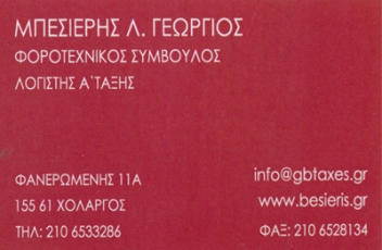 customer tabsΕπικοινωνίαΦορολογικές δηλώσειςΕνφιαΥποβολή ΑΠΔΡύθμιση οφειλώνΤήρηση βιβλίωνΑπόδοση Φ.Π.Α.Το Λογιστικό Φοροτεχνικό Γραφείο ΜΠΕΣΙΕΡΗΣ ΓΕΩΡΓΙΟΣ & ΣΥΝΕΡΓΑΤΕΣ είναι μια επιχείρηση που δραστηριοποιείται στην παροχή Λογιστικών Φοροτεχνικών υπηρεσιών από το 1987.Με έμπειρο επιστημονικό προσωπικό οποίο συνεχώς επιμορφώνεται προκειμένου να μπορεί να ανταπεξέλθει τις αυξημένες απαιτήσεις των Φορολογικών θεμάτων Με σύγχρονες κτιριακές εγκαταστάσεις και μηχανολογικό εξοπλισμό αιχμής το γραφειο πρωτοστατεί στην προσπάθεια των επιχειρήσεων για εκπλήρωση των σχεδιασμένων πρωτοβουλιών .Το στελεχικό δυναμικό της εταιρείας απαρτίζεται από εξειδικευμένο επιστημονικό προσωπικό Λογιστών Α & Β Τάξης πτυχιούχων ανωτάτων σχολών με πολυετή εμπειρία και γνώση σε όλο το φάσμα των Λογιστικών Φορολογικών Υπηρεσιών.Με βάση την εμπειρία και την γνώση μας έχουμε δημιουργήσει δυο γενικές υπηρεσίες προς Ιδιώτες και προς Επιχειρήσεις. Βασιζομένη στην υψηλή ποιότητα Λογιστικών Φορολογικών Υπηρεσιών ο στόχος μας είναι η αποφυγή κατά το δυνατόν και στα πλαίσια των ελληνικών νόμων της υπέρμετρης φορολόγησης και στην εξεύρεσή αξιόπιστων λύσεων.Η επιτυχία της συνεργασίας μας βασίζεται στην πολυετή πείρα μας στην συνέπεια στην αξιοπιστία και στην εχεμύθεια μας. Λογιστικές- Φοροτεχνικές ΥπηρεσίεςΥπηρεσίεςΦανερωμένης 11Α, ΧολαργόςΧΟΛΑΡΓΟΣ ΑΤΤΙΚΗΣΑΤΤΙΚΗ 21065332862106528134info@gbtaxes.grwww.besieris.gr Το προτείνω (έχει προταθεί 0 φορές) ΦωτογραφίεςFacebook LikeShare on FacebookTweet Widget