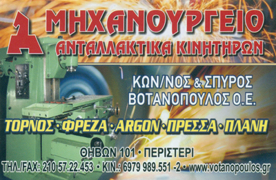 customer tabsΕπικοινωνίαΜηχανουργεία και ΗλεκτρομηχανουργείαΥπηρεσίεςΘηβών 101, ΠεριστέριΠΕΡΙΣΤΕΡΙ ΑΤΤΙΚΗΣΑΤΤΙΚΗ 2105722453 6979989551 6979989552spy.votano78@gmail.comwww.votanopoulos.gr Το προτείνω (έχει προταθεί 0 φορές) ΦωτογραφίεςFacebook LikeShare on FacebookTweet Widget