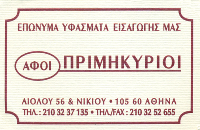 customer tabsΕπικοινωνίαΕπώνυμα υφάσματα ένδυσης εισαγωγήςΥφάσματα ένδυσηςΑνδρικά ΥφάσματαΥλικά ραπτώνΥφάσματαΕίδη και Υλικά ΡαπτικήςΑντρική Ένδυση - ΥπόδησηΛοιπάΑιόλου 56, ΑθήναΑΘΗΝΑ ΑΤΤΙΚΗΣΑΤΤΙΚΗ 2103237135 21032526552103252655primik56@gmail.com Το προτείνω (έχει προταθεί 1 φορές) ΦωτογραφίεςFacebook LikeShare on FacebookTweet Widget